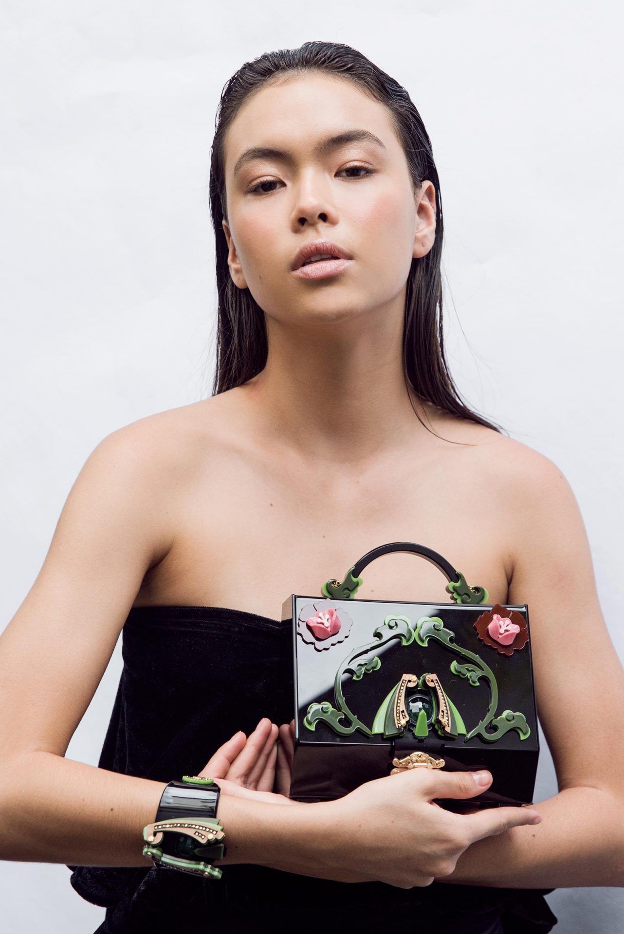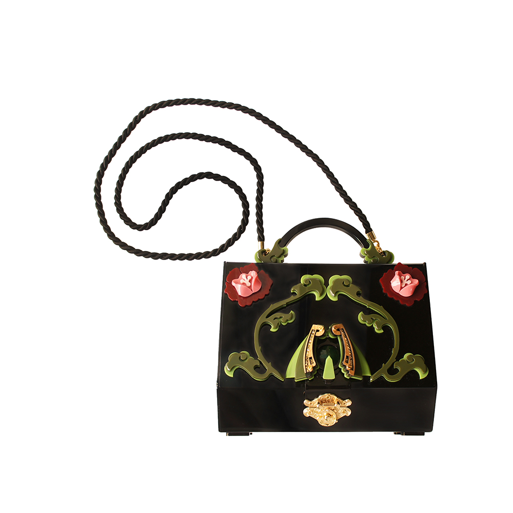 Floral and Moth Clutch, trunk model, box and applications made of acrylic, combined with application of cherry formica, glass rhinestones, with glass stone, removable handle in San Francisco rope and fixed handle of acrylic, metals with gold finish. Handmade by Brazilian artisans.