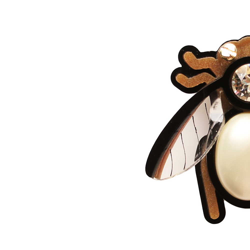 Bee Brooch, made of acrylic, with application of glass rhinestones, cabochon shell pearl, with metals with gold finish. Handmade by Brazilian artisans.