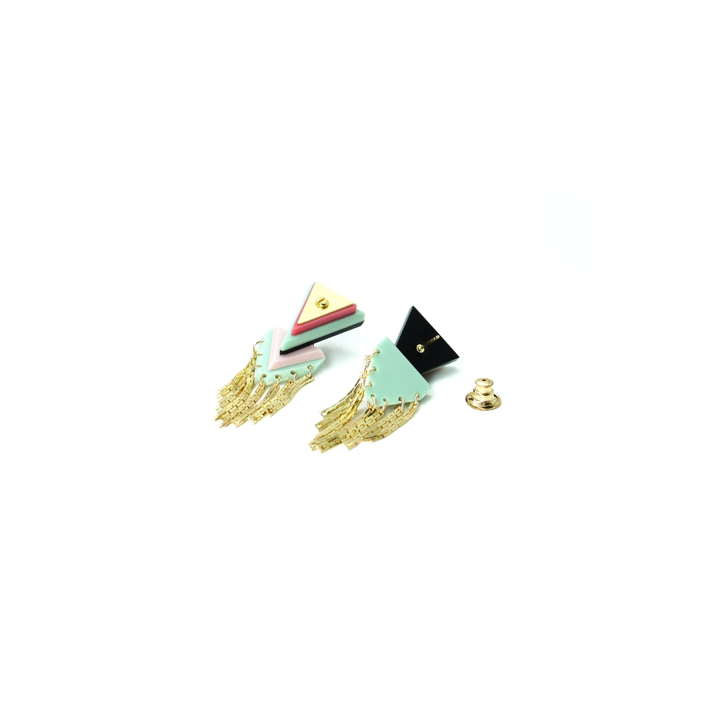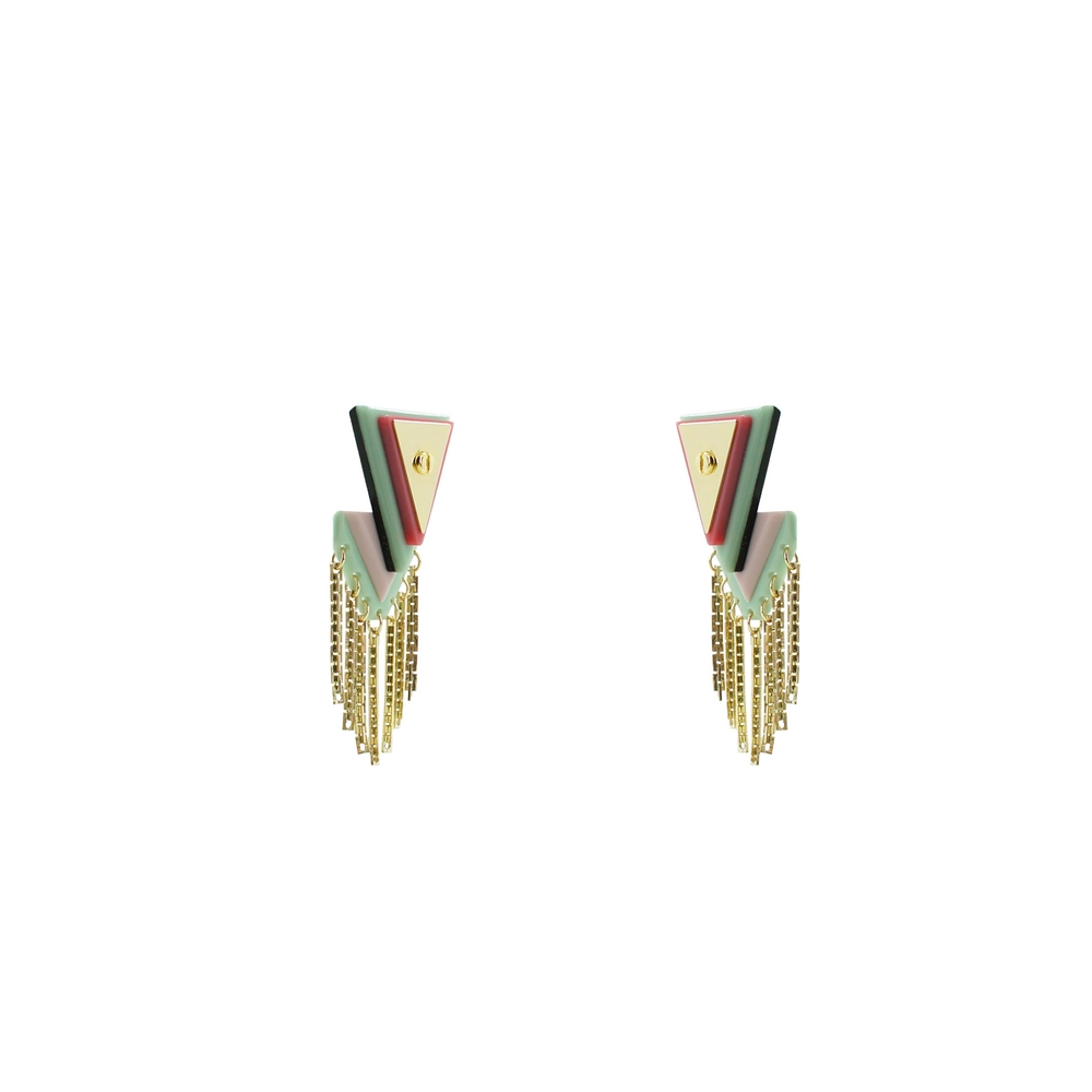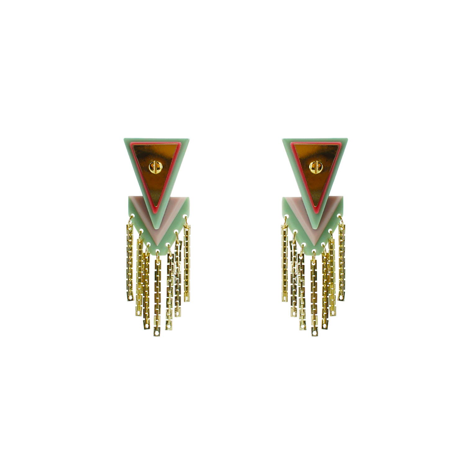 Medium acrylic earring with filigree application, with chain fringe and gold finish metals. Handmade by Brazilian artisans.