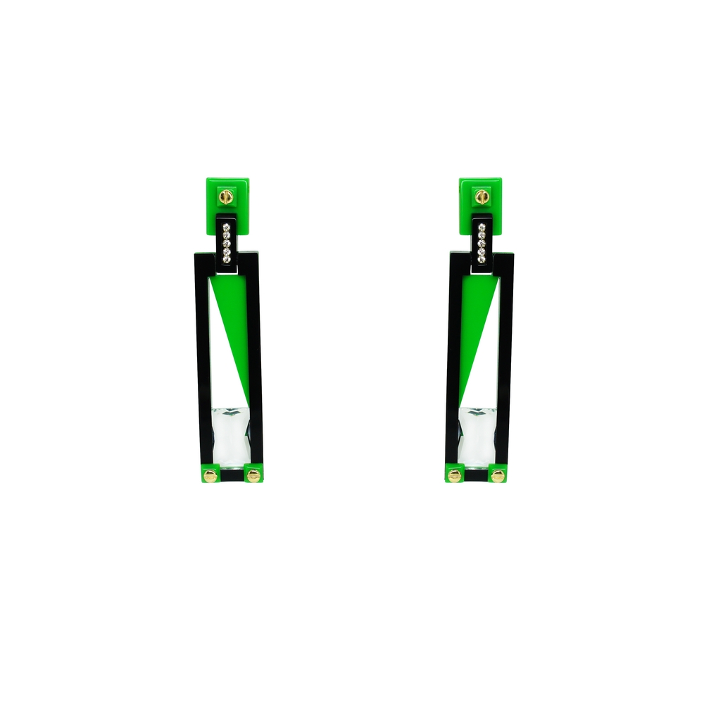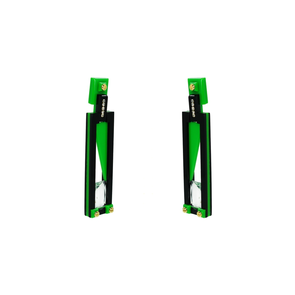 Long acrylic earring with glass stone and glass rhinestones application. Handmade by Brazilian artisans.