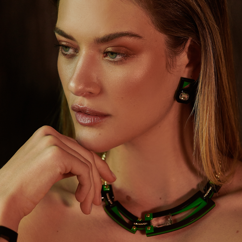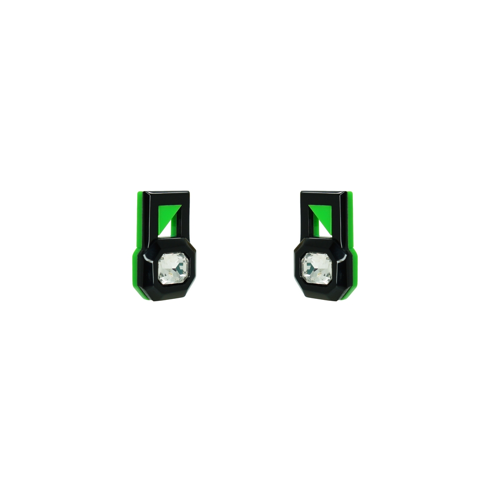 Acrylic earring, with octagonal glass stone application and gold finish metals. Handmade by Brazilian artisans.