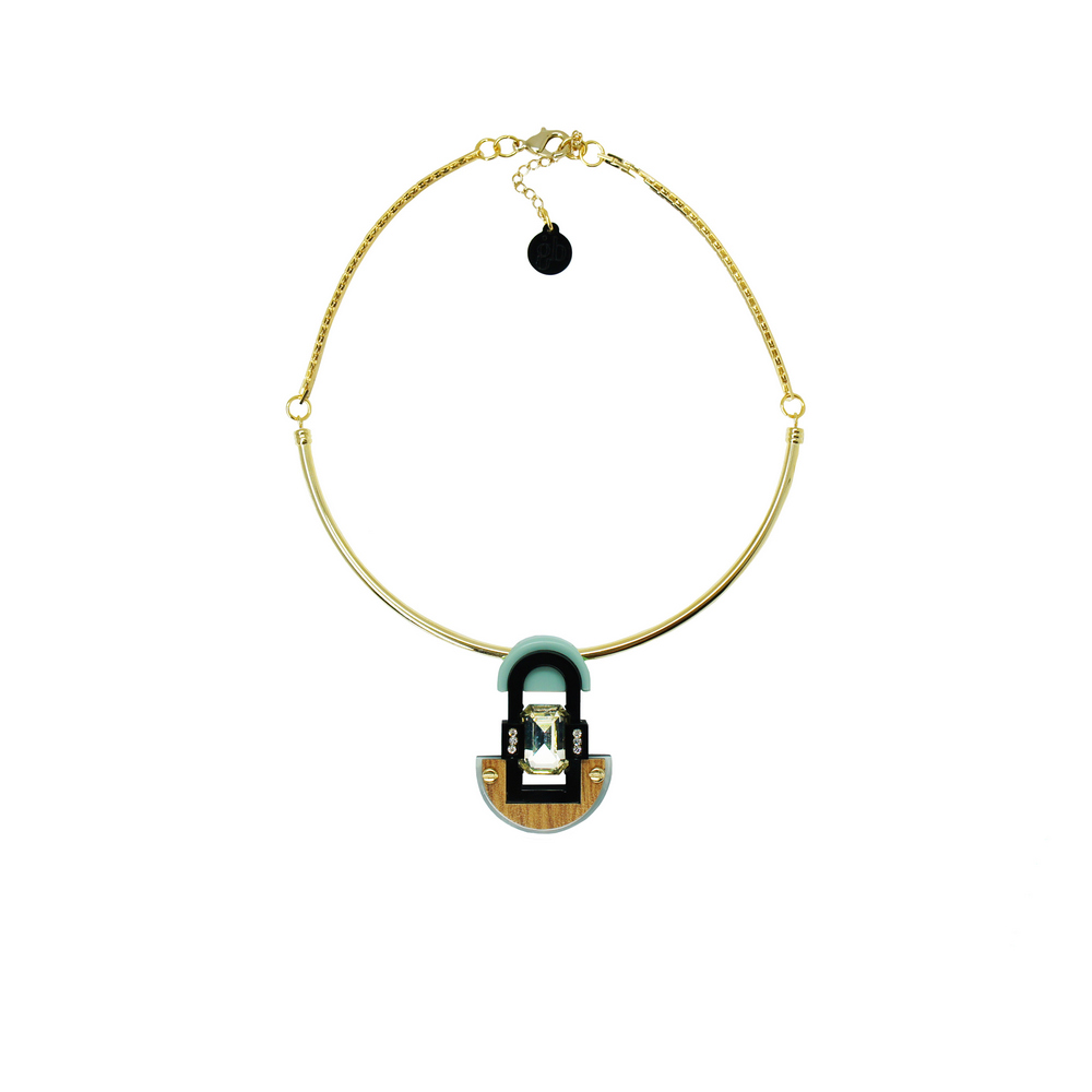 Necklace made of acrylic, pendant model, with application of rhinestones in glass, with glass stone, with chains and golden finish. Handmade by Brazilian artisans.